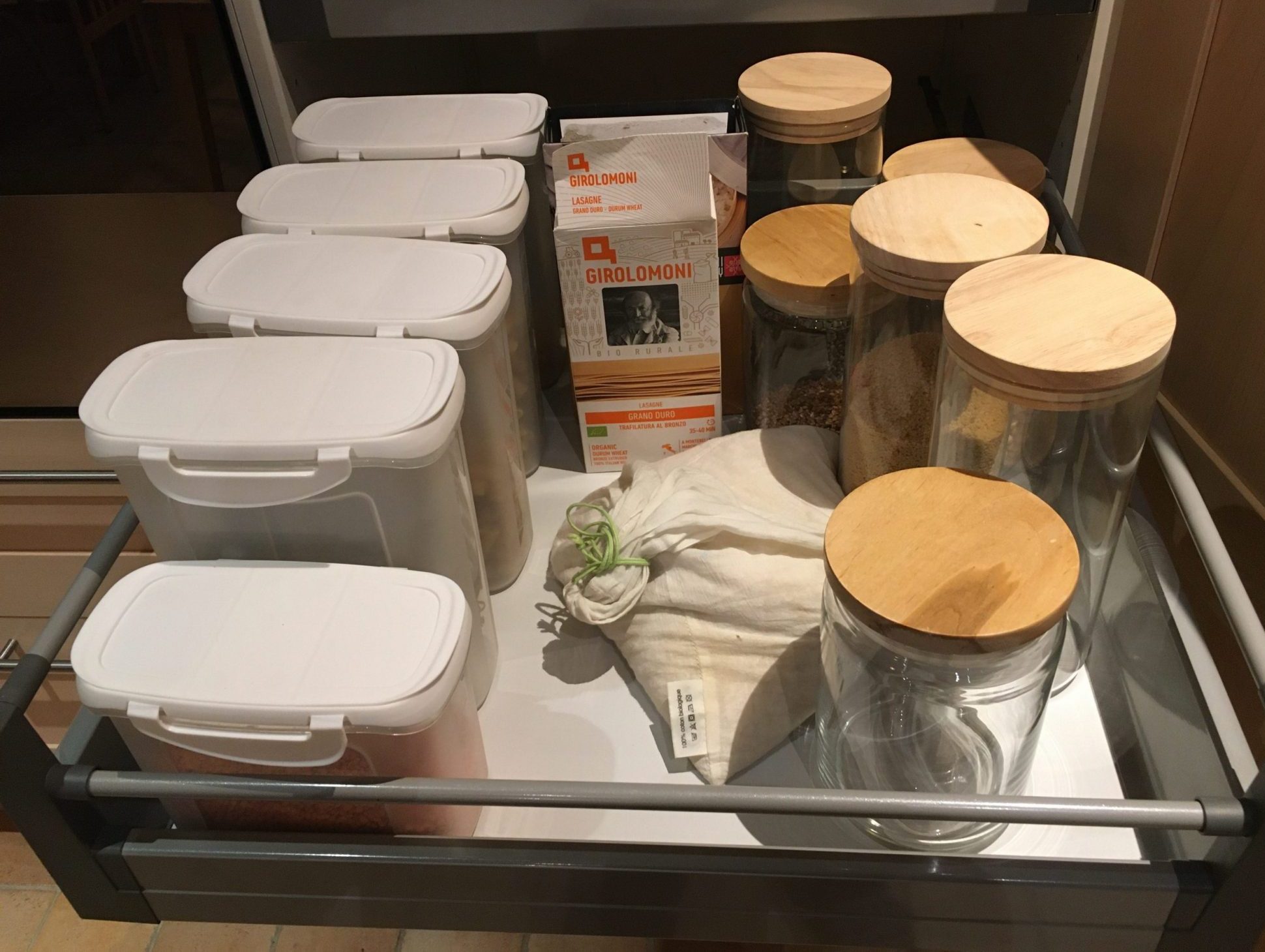 Dès lors le mouvement est lancé. Les produits ménagers sont achetés en vrac dans des contenants rechargeables et les savons et shampoings liquides en bouteilles sont remplacés par des solides. Côté cuisine, les courses se font désormais à la coupe ou en vrac lorsque c’est possible (céréales, gâteaux, légumes, viande, etc.) et en apportant ses propres contenants. Les repas sont anticipés pour éviter le gaspillage et les assiettes et verres jetables sont bannis de la maison. Pour les épluchures : « on faisait déjà du compost mais on a construit un poulailler et acheté des poules la 2ème année ».
